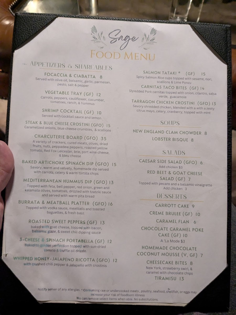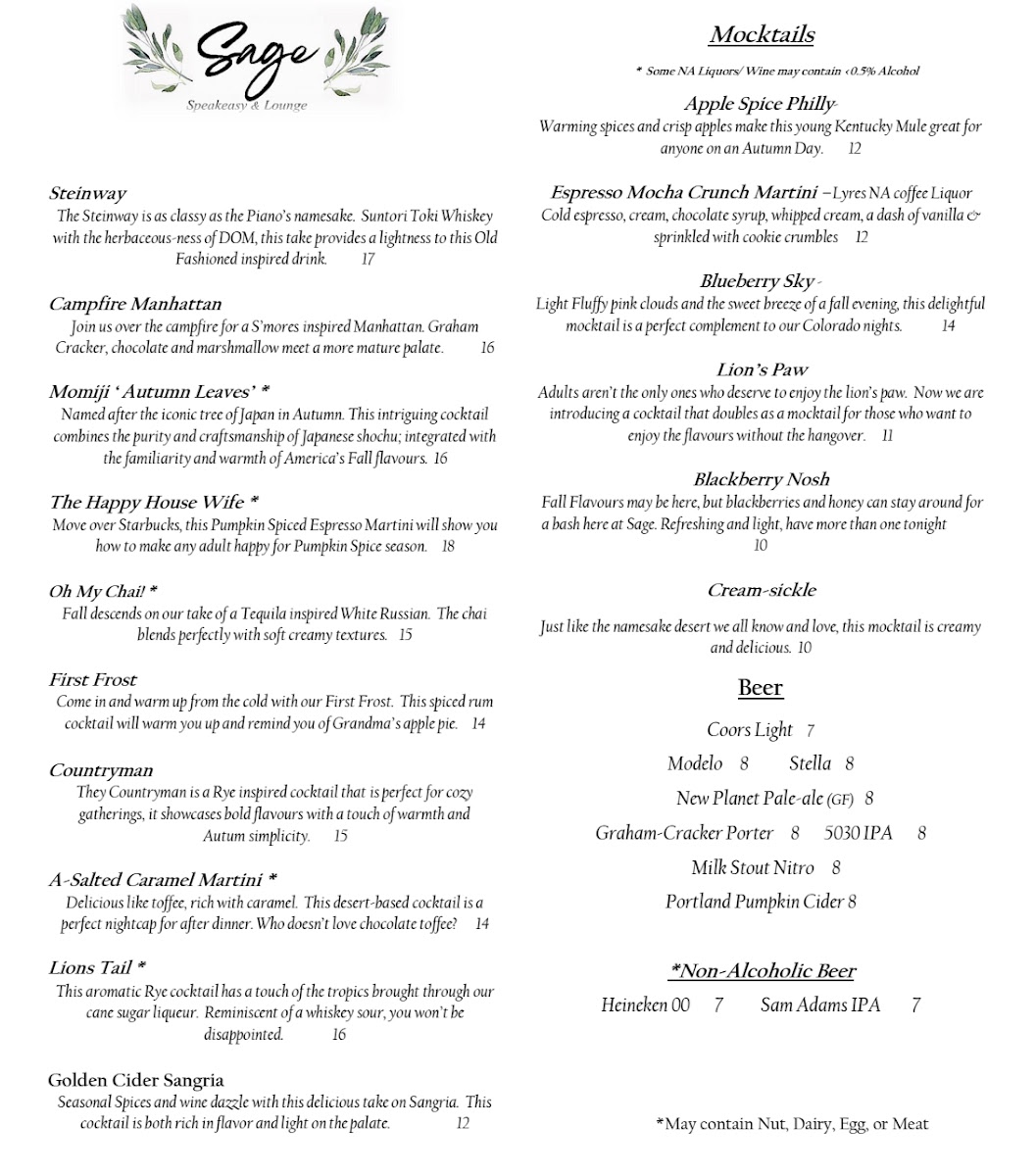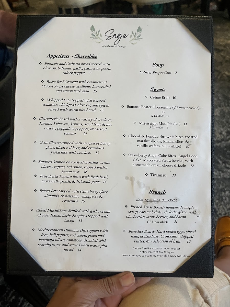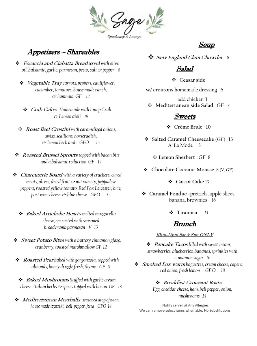 The menu at Sage Speakeasy & Lounge offers a carefully curated selection of shareable bites and thoughtfully crafted cocktails designed to complement its warm, intimate atmosphere. You’ll find a mix of approachable appetizers like baked stuffed mushrooms and fresh vegetable trays alongside comforting options such as lobster bisque or steak and herb mash bites. These dishes fit seamlessly into both casual gatherings and more refined evenings out, providing flavors that feel both familiar and elevated.
